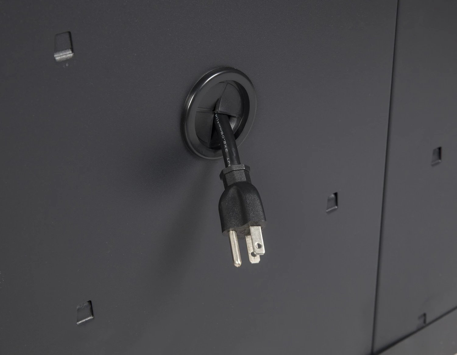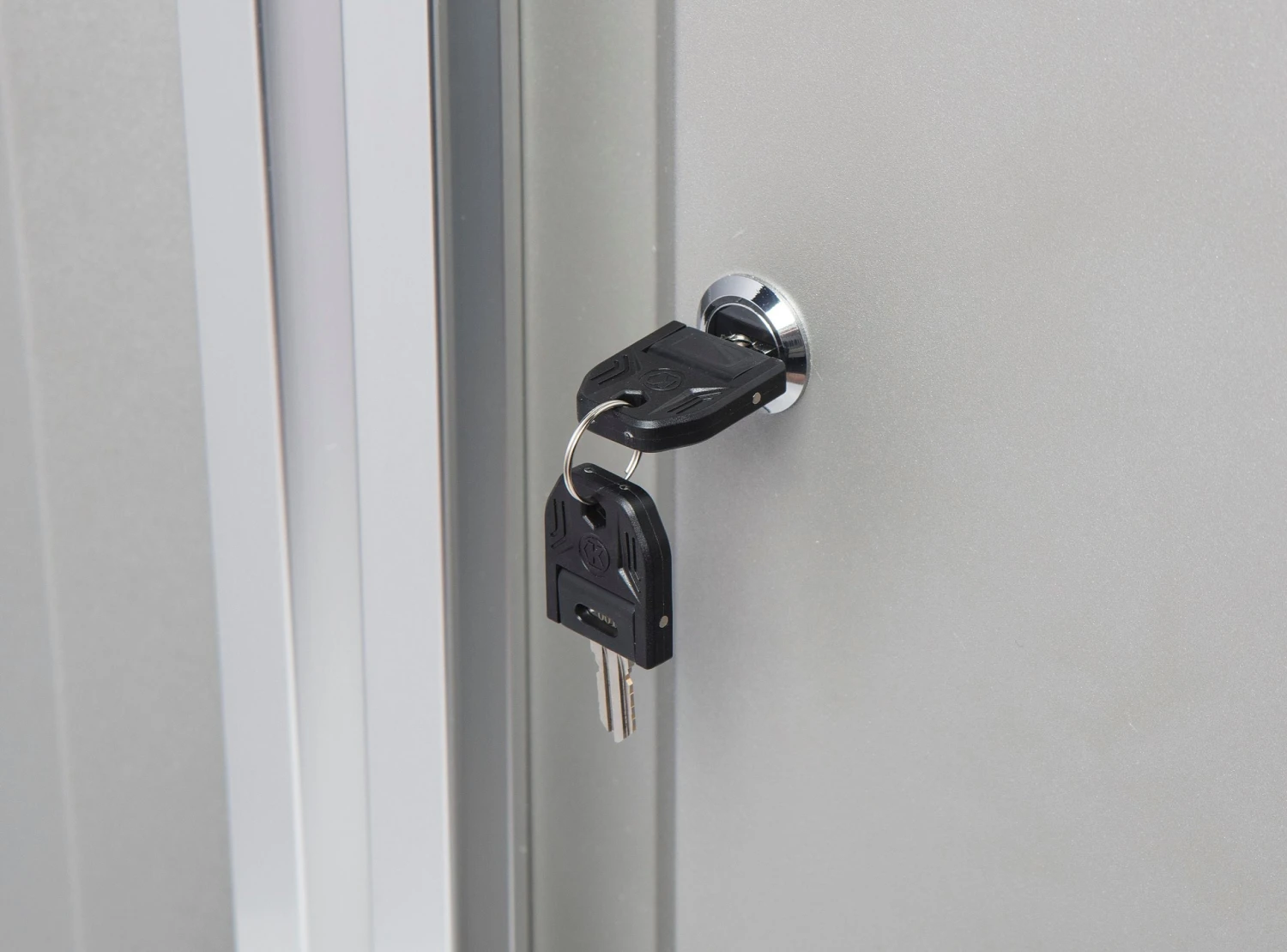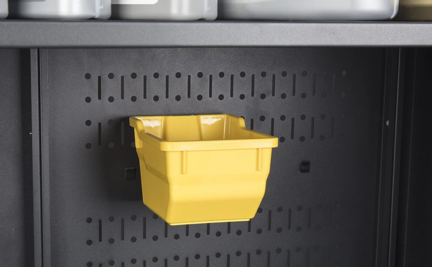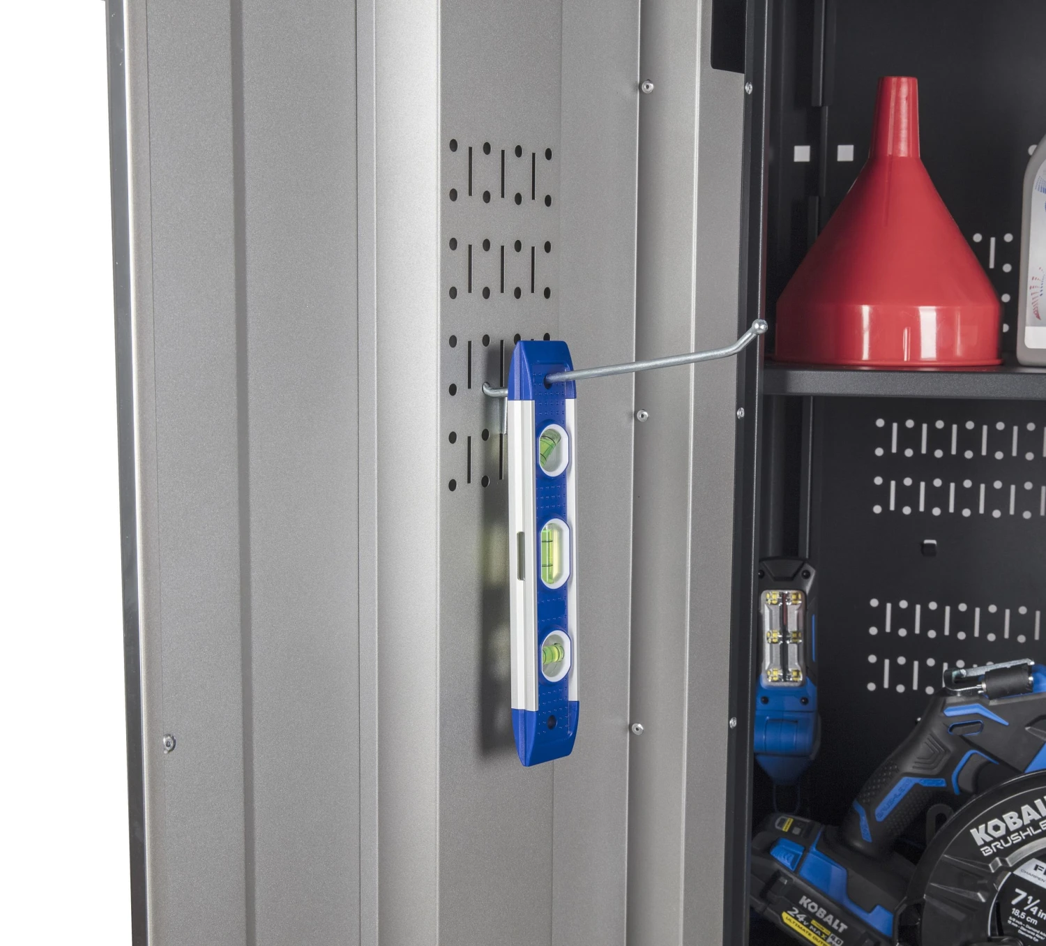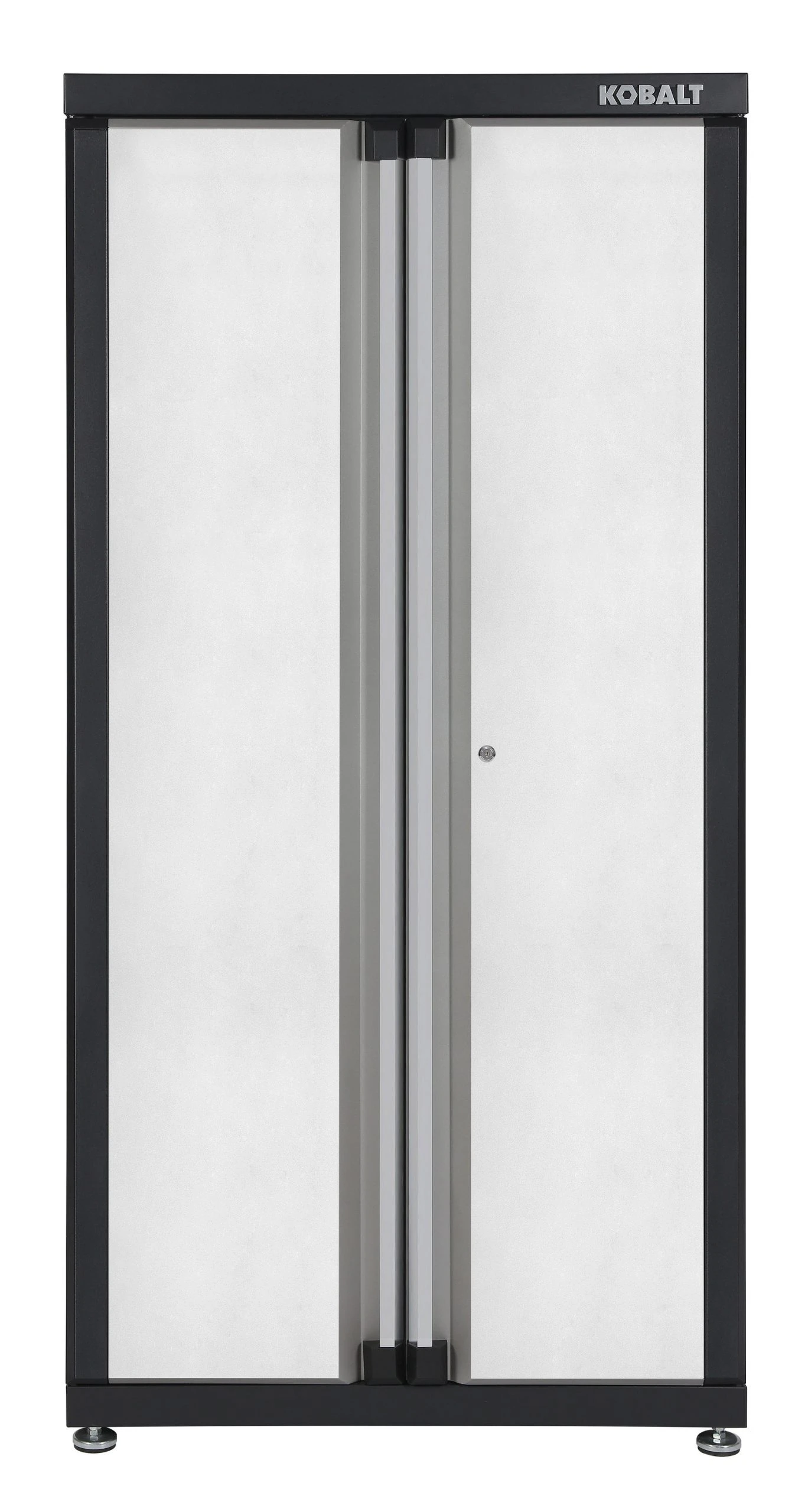 With heavy-duty construction and a powder-coated finish, this cabinet offers a durable storage solution for your garage. The 2-door, 36in tall cabinet is engineered for quick assembly and includes 4 shelves; 3 of these are adjustable. Each shelf has a weight capacity of 150lbs. pegboard on the back wall and the both doors give you unbeatable storage space for pegs and bins. The doors are lockable for peace-of-mind security. The back panel features 2 grommets for cord accessibility. Uneven floor? No problem…the adjustable feet can compensate. Complete your garage suite with other pieces like the work table, small base cabinet, or a wall cabinet (each sold separately). Dimensions are 72-inches H, 36-inches W, and 18.5-inches D.