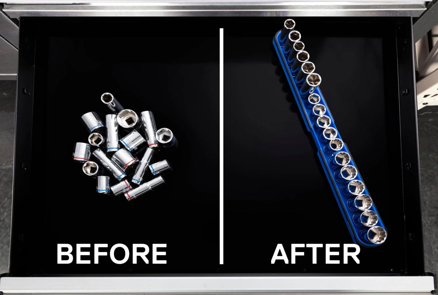 This large magnetic socket organizer set will help you keep your sockets and small parts organized and in place at any angle. Rubber coating will help to keep painted metal surfaces scratch-free when the organizers are connected. The tray’s dual-purpose magnets secure sockets and allow mounting to metal surfaces, meaning you can count on your sockets staying in place, even if the tray is upside down! Compliments our small and medium trays to keep all your sockets organized!