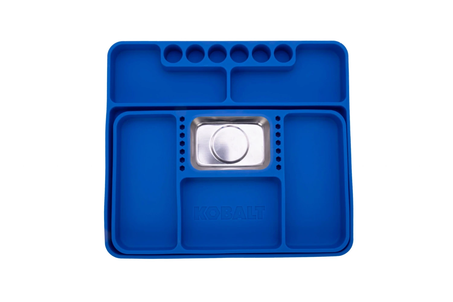 Protect finished and painted surfaces while keeping your tools at your fingertips with our new Kobalt 2-piece nesting silicone tool tray set. These 100% silicone trays are molded without any stiff interior supports which allows them to flex and conform to the contours of whatever surface they are laid on to provide you with non-slip storage for parts, tools, and components wherever you need them. Each tray has flexible interior dividers to let you easily organize and separate small fasteners and components for quick access. The silicone construction resists most common automotive and household chemicals and is easy to wash clean when soiled. The smaller trays contains a magnet to hold small pieces in place when on an uneven surface and comfortably nests inside the larger tray for compact and easy storage. Perfect for use in mechanical maintenance and automotive repairs in the shop and on the job or for use in the house for hobby projects.