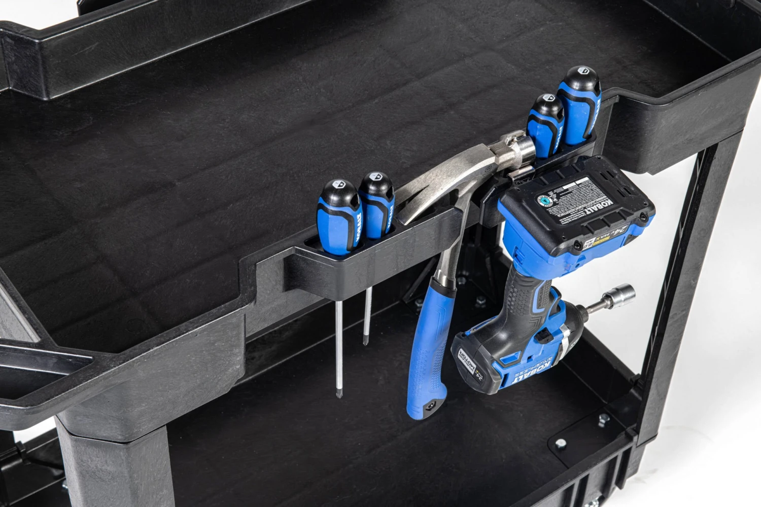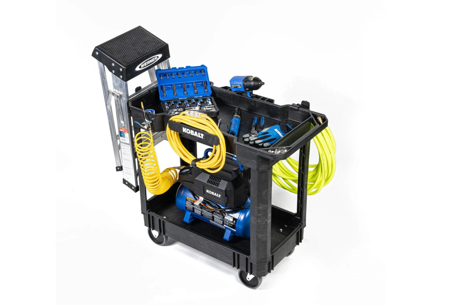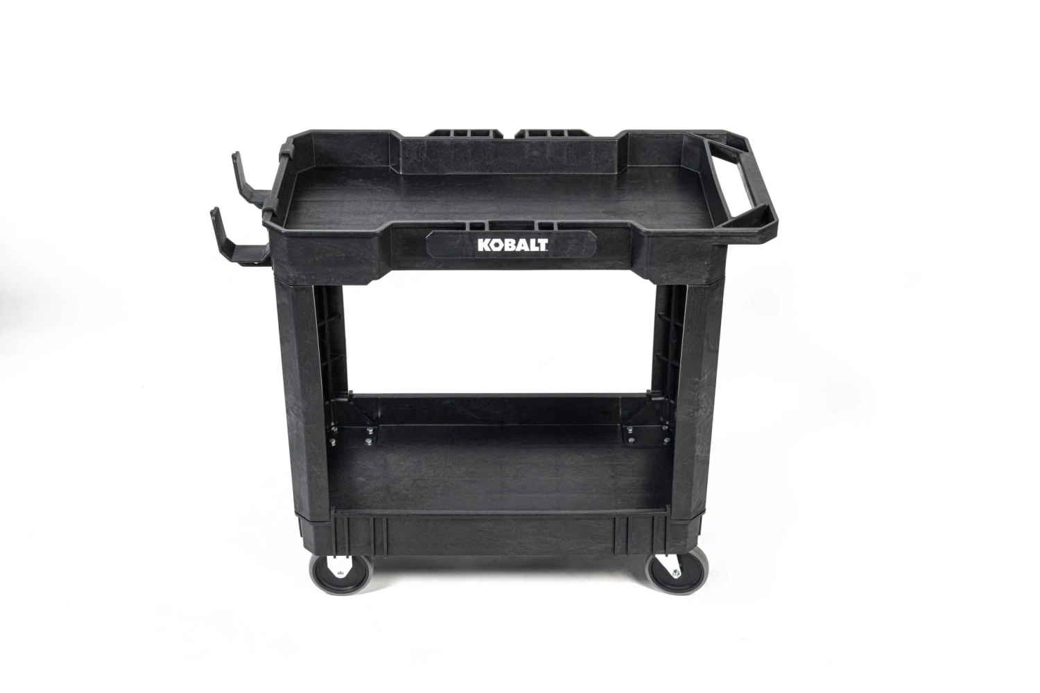 Kobalt two shelf utility cart is the perfect solution for bringing your tools and materials on the go! This utility car is designed with heavy duty materials for extra strength and durability. With 4″ casters for extra mobility, this heavy-duty cart will allow you to move around with your tools and materials with ease. To ensure customer satisfaction, we designed this cart strategically to benefit you. Some of these benefits include a; tool holder, parts tray, cord wrap, pass through hook and handle for your convenience. Get yours today and get those mobile projects done!